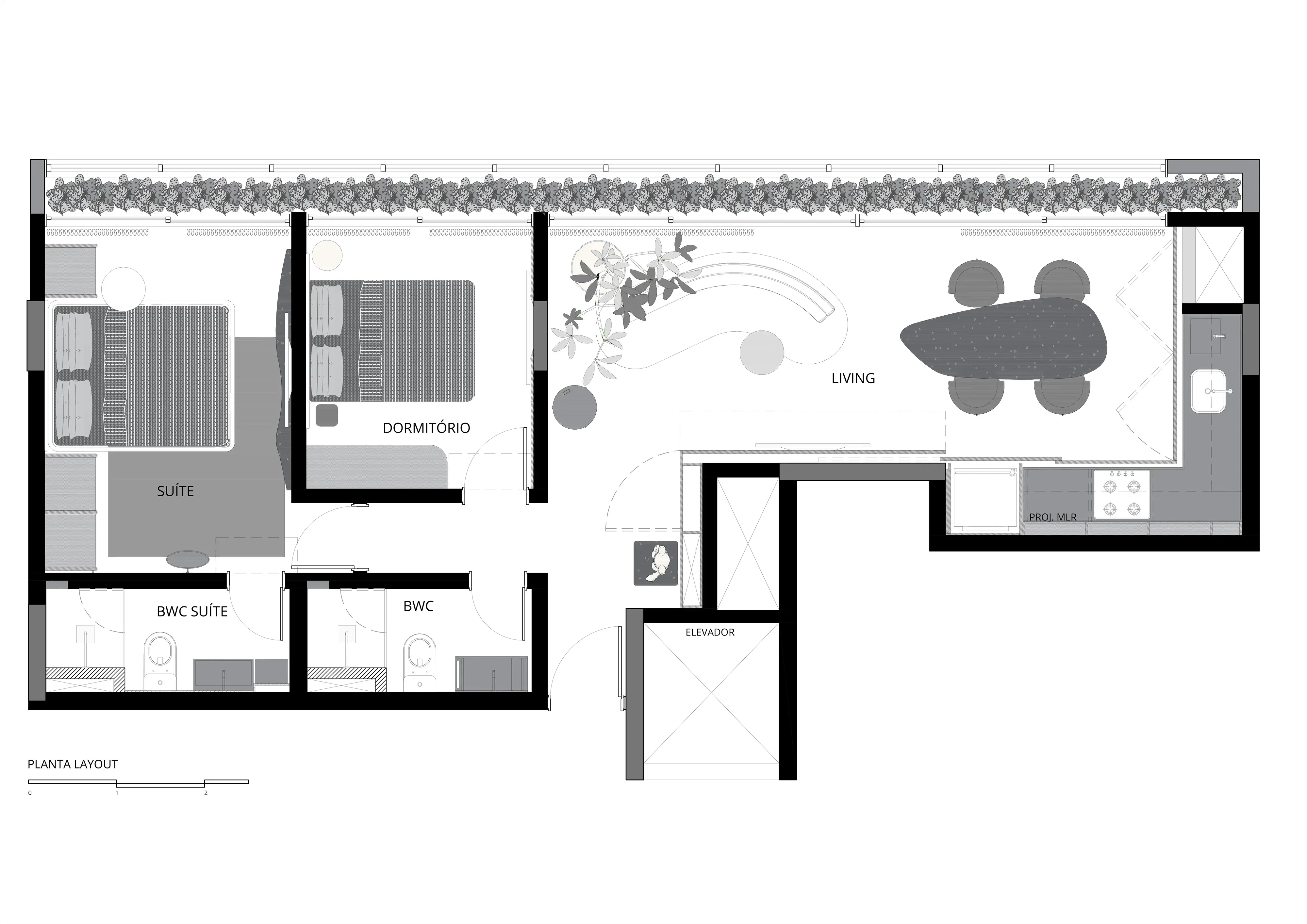 O projeto explora contrastes: o minimalismo da base encontra a expressividade dos materiais, da arte e da vida cotidiana.