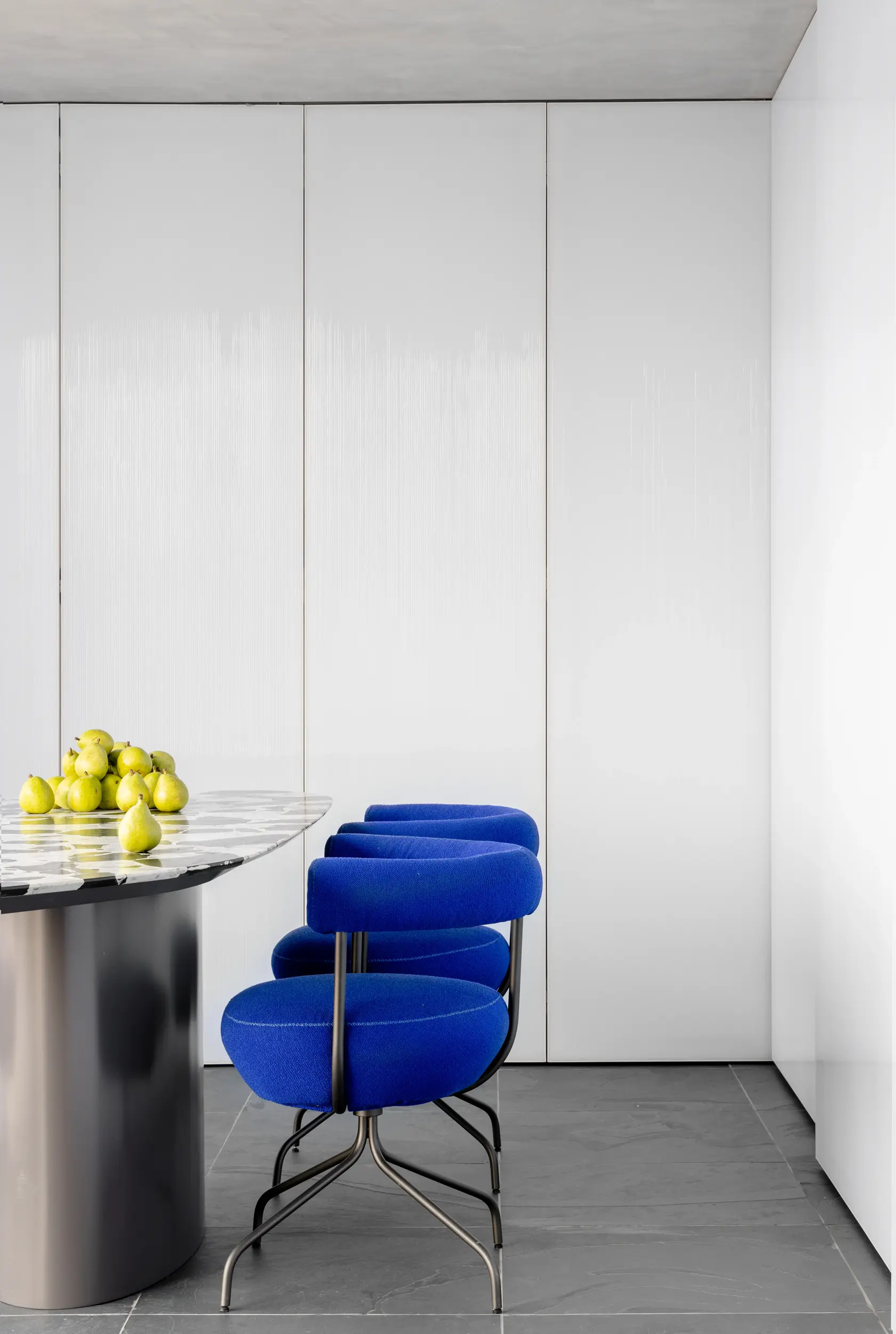 Poltrona escultural azul sobre piso marmorizado no Apto Prisma, design contemporâneo do Studio Guilherme Garcia.