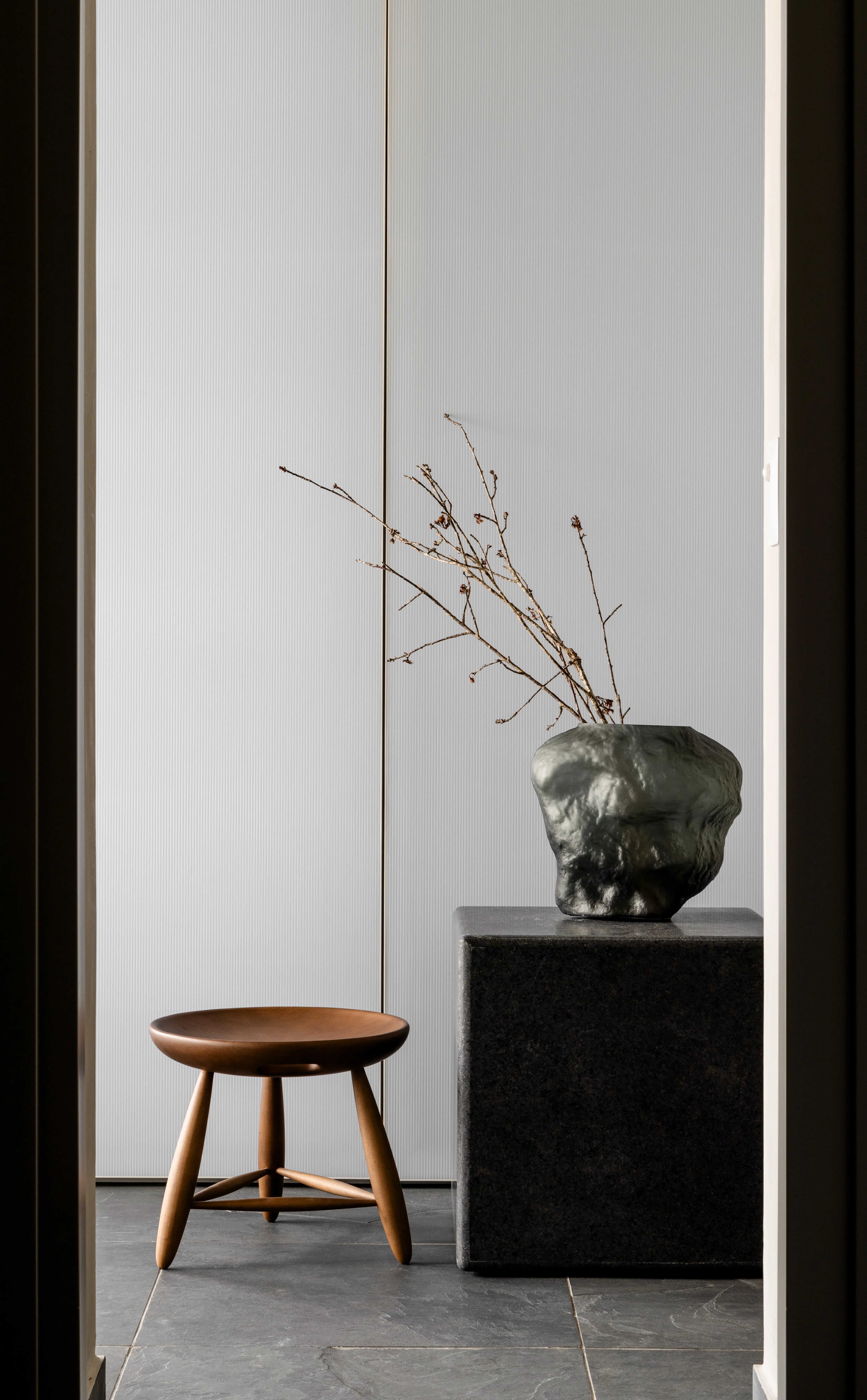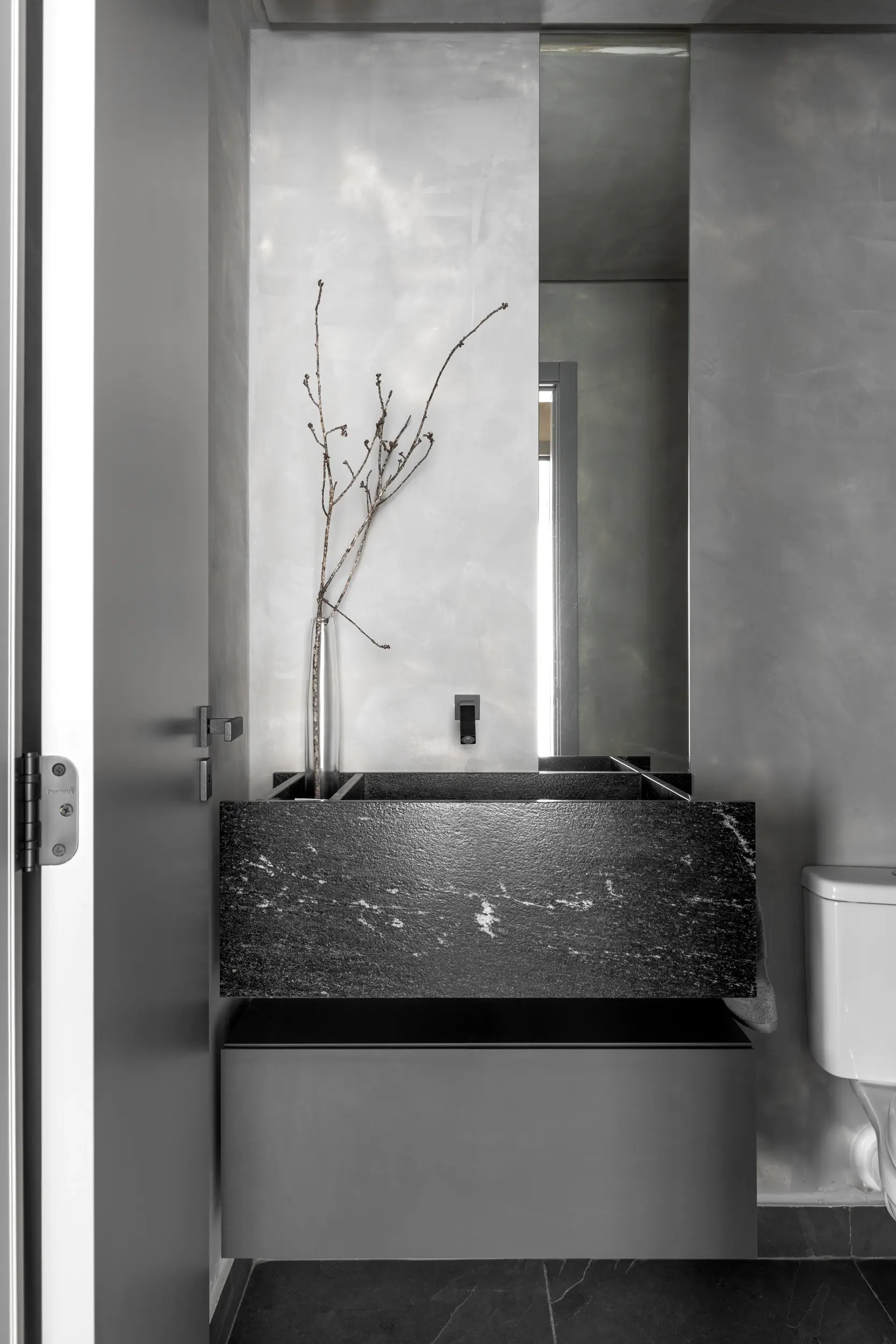 Detalhe decorativo com galho seco e espelho orgânico no Apto Prisma, por Studio Guilherme Garcia.