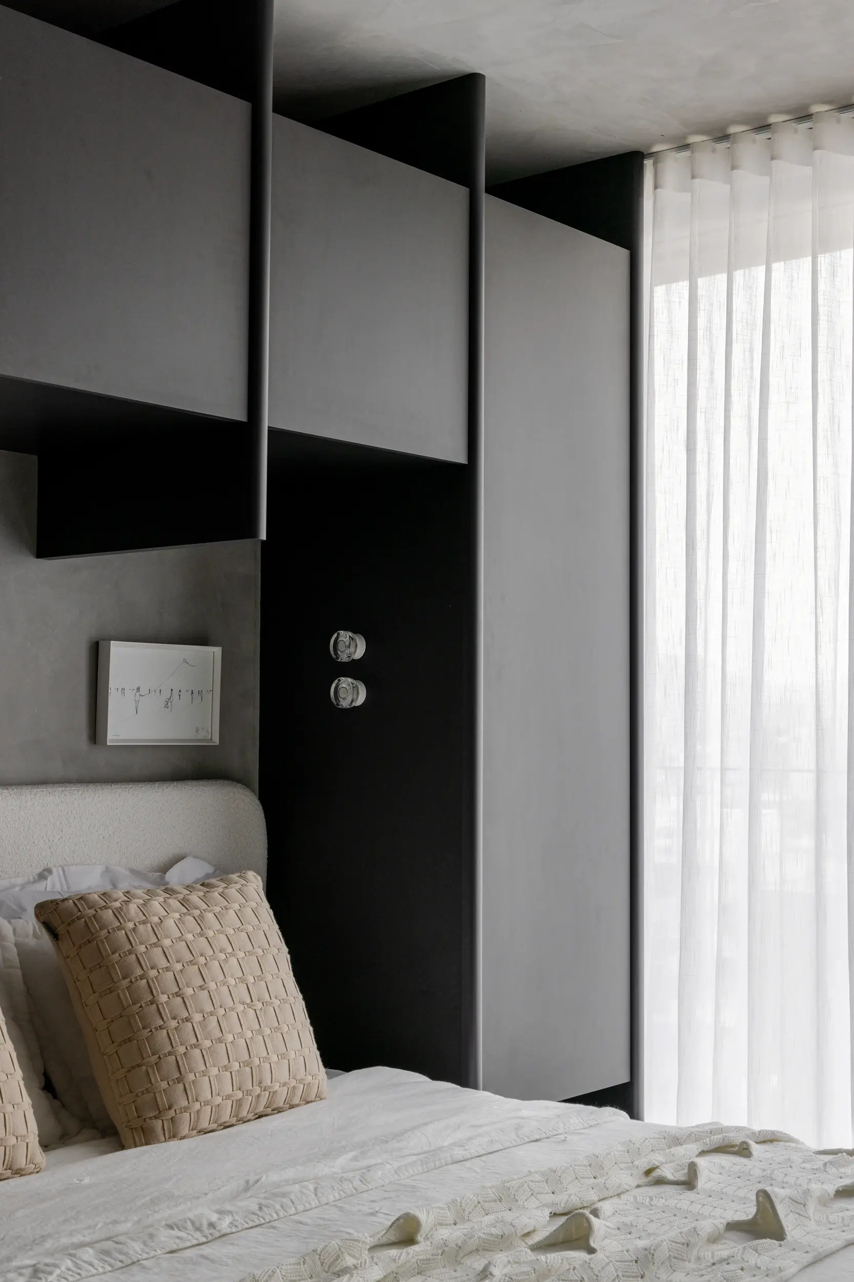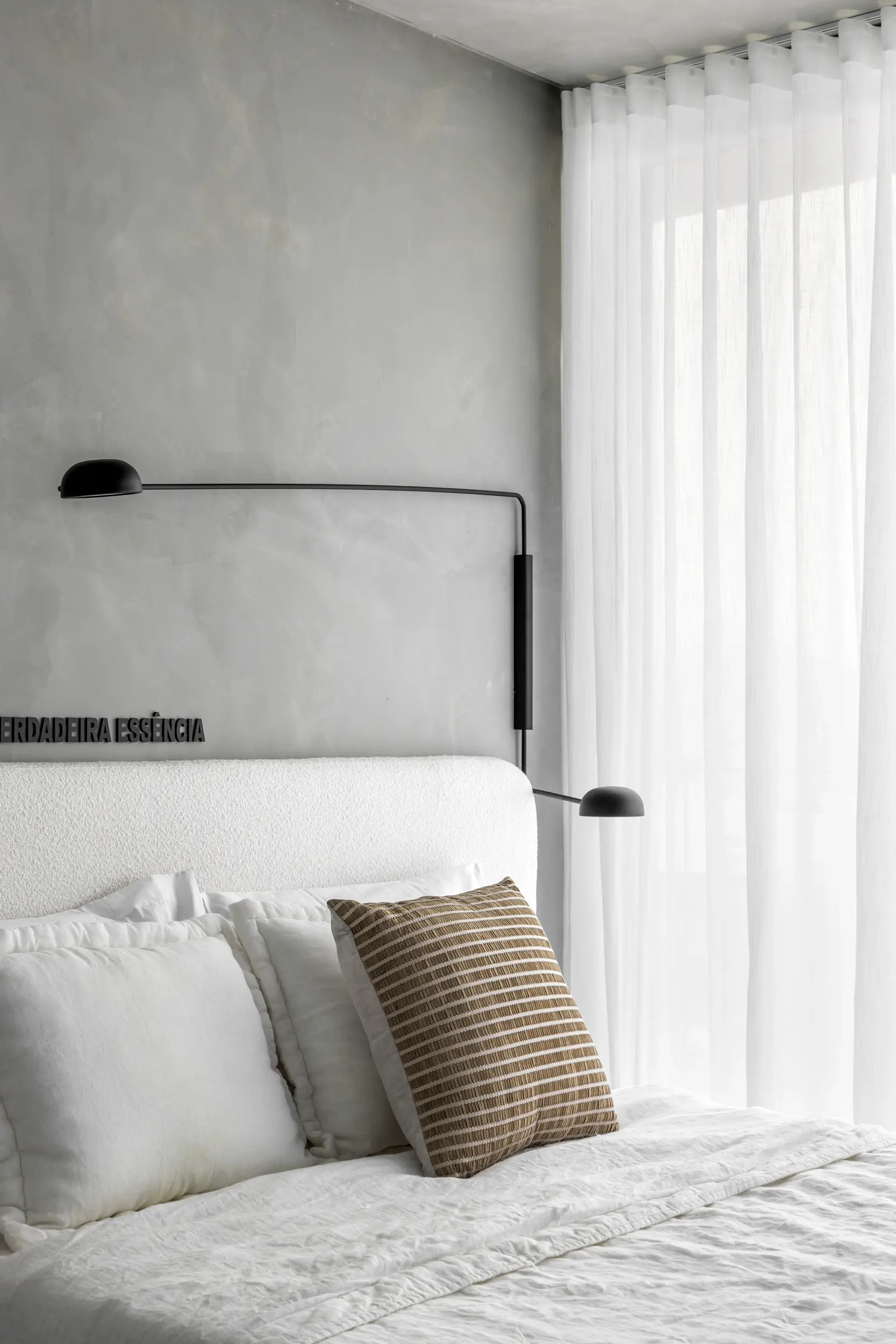 Quarto minimalista com iluminação suave e composição têxtil no Apto Prisma, projeto do Studio Guilherme Garcia.
